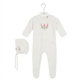 אוברול סריג צבע שמנת פרח רקמה לבנדר ורוד